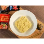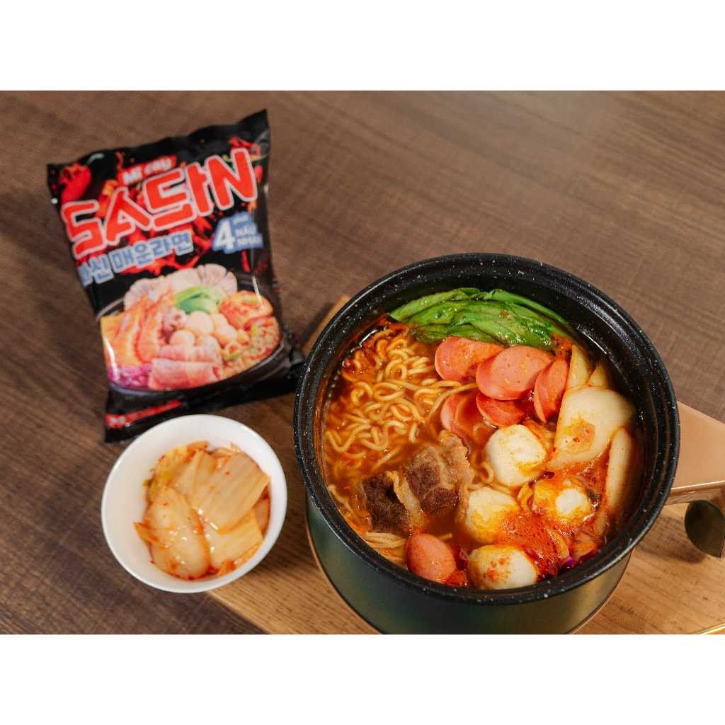 Gói mì gồm có: 1 Vắt mì Sasin, 1 gói gia vị Mì Cay Sasin Đặc Biệt – vị Kimchi, 1 gói dầu.